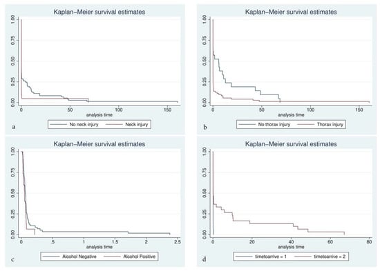 Figure 1 and Figure 2 depict the Kaplan–Meier estimated survival curves, illustrating survival probabilities based on time to arrival, history of alcohol abuse, neck trauma, abdominal trauma, chest trauma, multiple-site injuries, Central Nervous System (CNS)-affecting positive toxicological examination, and presence of recently ingested food.