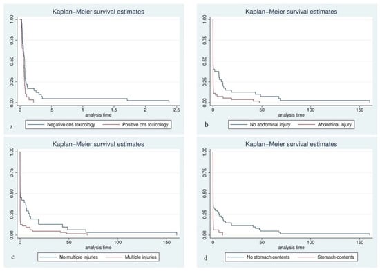 Kaplan–Meier survival curves for: (a) Survival probabilities by psychoactive toxicology findings (positive vs. negative). (b) Survival probabilities by abdominal trauma (present vs. absent). (c) Survival probabilities by multiple injuries (present vs. absent). (d) Survival probabilities by stomach contents (empty vs. with contents). The x-axis represents time in days. Each curve demonstrates variations in survival probability across the corresponding clusters.
