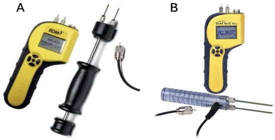 (A) Delmohorst RDM-3 moistureTM meter with 26-E electrodes; (B) Delmohorst RDM-3 moistureTM meter with 22-E electrodes.