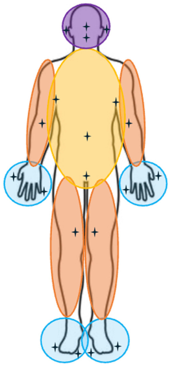 Data collection locations and averaged body regions for analytical categorization. Data collection locations are represented with a four-point star. Colored overlays denote each region: the head is indicated in purple; the torso is in yellow; the limbs (both upper and lower) are in orange; and the extremities are in blue.