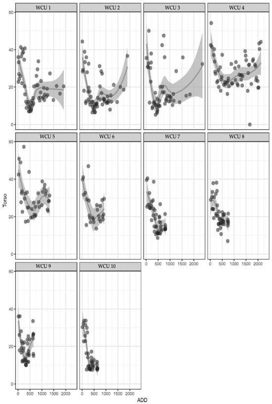 Scatterplot with LOWESS curve of torso measurements. The y-axis represents moisture content, while the x-axis represents ADD. The shaded area represents statistically smoothed data. Darker gradients represent overlapping data points.