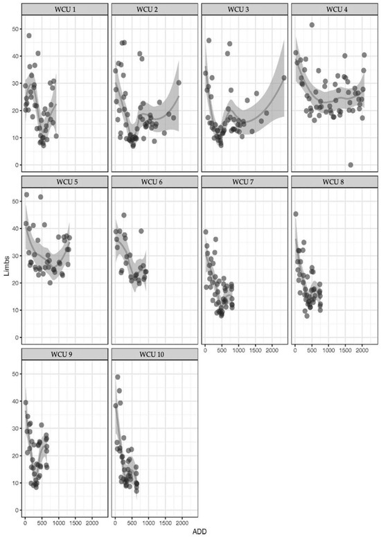 Scatterplot with LOWESS curve of limb measurements. The y-axis represents moisture content, while the x-axis represents ADD. The shaded area represents statistically smoothed data. Darker gradients represent overlapping data points.
