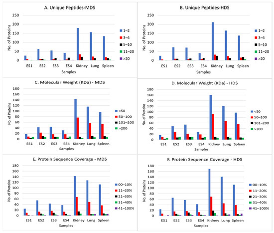 Distribution of unique peptides, molecular weight and protein sequence coverage of the proteins identified in known (human kidney, lung and spleen) and questioned (ES1–ES4) samples. Mammalian (MDS) and human (HDS) databases were searched. Only peptides identified with high confidence were selected. Panels (A,B) are the number of unique peptides used for identification of proteins in each sample. The bar color blue represents 1–2 peptides; red, 3–4 peptides; black, 5–10 peptides; green, 11–20 peptides, and purple, >20 peptides. Panels (C,D) are the calculated molecular weights of the proteins identified in each sample. The bar color blue represents <50 KDa; red, 50–100 KDa; black, 101–200 KDa, and green, >200 KDa. Panels (E,F) are the % protein sequence coverage of the identified proteins. The bar color blue represents 0—10% coverage; red, 11–20% coverage; black, 21–30% coverage; green, 31–40% coverage, and purple, 41–100% coverage.
