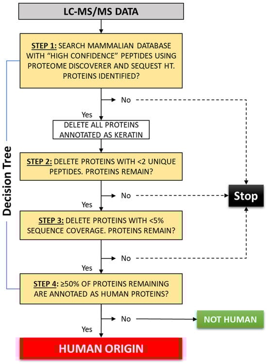 This means that all the samples (known and unknown) contained >50% of proteins annotated as human after the multi-step filtration process. For this reason, the sources of the four questioned samples (ES1–ES4) were identified as human. This classification was subsequently confirmed via DNA STR analysis. Based on the experimental findings, a decision tree (Figure 2) was developed to provide a standardized approach for presumptive identification of human tissue using bottom-up proteomics data.