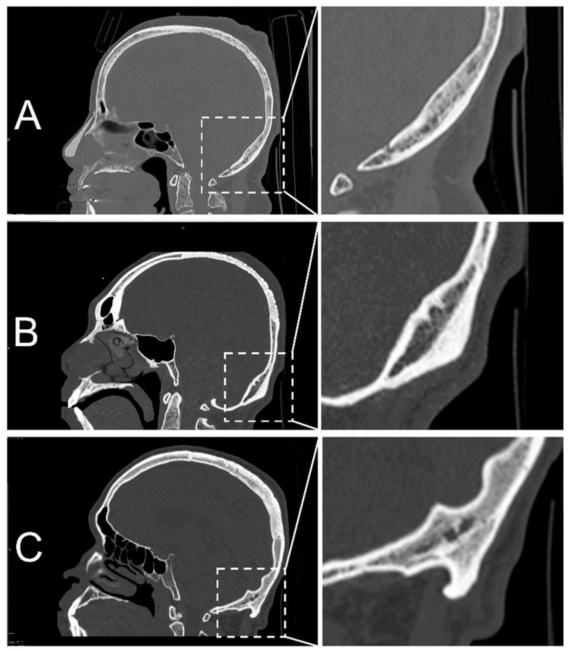 - Çağlayan, F.; Güller, H.; Öncü, E.; Kuzey, N.; Dalcı, H. The Frequency of Occipital Spurs in Relation to the Cephalic Index: An Anatomorphometric Cone Beam CT Study. Niger. J. Clin. Pract. 2024, 27, 647–653. [Google Scholar] [CrossRef]