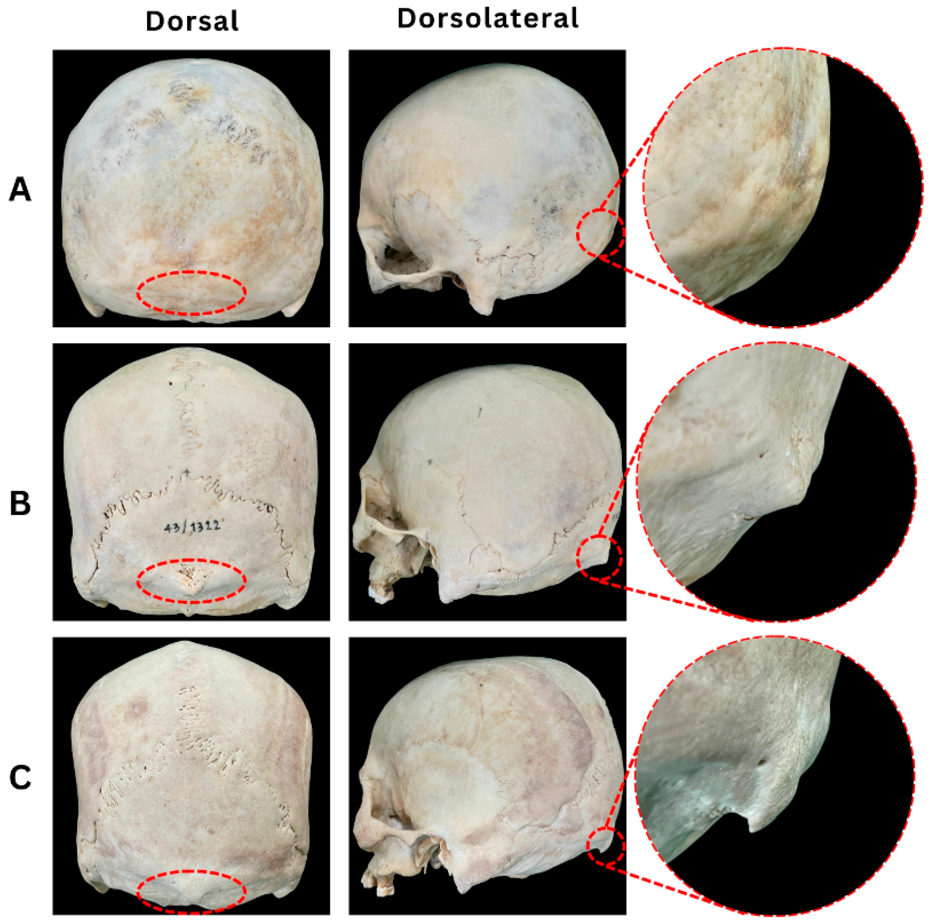 - Srivastava, M.; Asghar, A.; Srivastava, N.N.; Gupta, N.; Jain, A.; Verma, J. An Anatomic Morphological Study of Occipital Spurs in Human Skulls. J. Craniofac. Surg. 2018, 29, 217–219. [Google Scholar] [CrossRef]