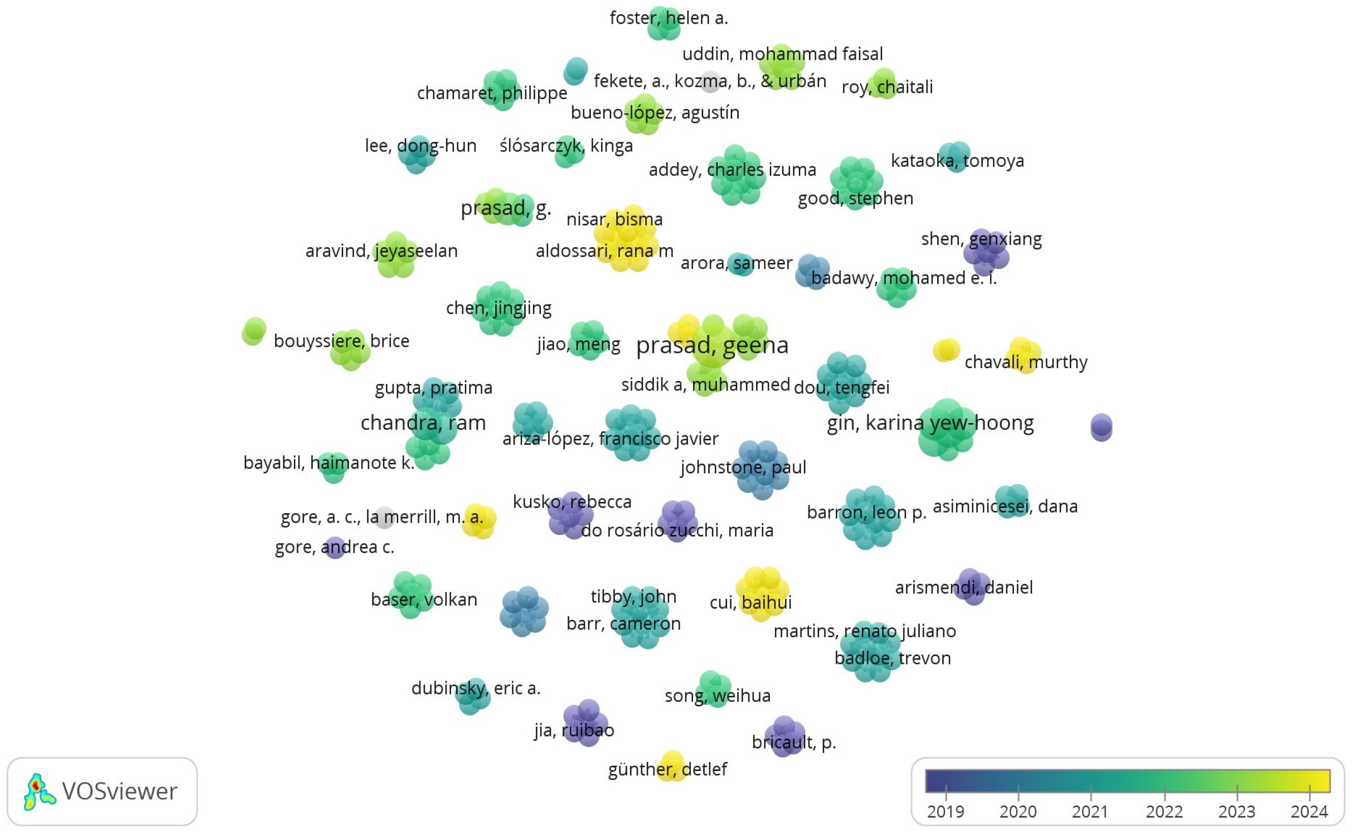 Figure 1 presents the overlay visualization of keyword co-occurrence generated using VOSviewer. The node size indicates the keyword frequency, and the color scale represents the average publication year of the manuscripts with the selected keywords. The evolution of the research themes over the years was visualized in blue or cyan, which represent earlier studies, or yellow, which shows more recent studies. Earlier studies were mostly centered on the occurrence, detection, and health-related impacts of conventional and emerging water contaminants; the research themes gradually evolved toward advanced analytical techniques, source attribution, and data-driven environmental forensic approaches through a period dominated by method development, validation, and applied monitoring studies (green nodes).