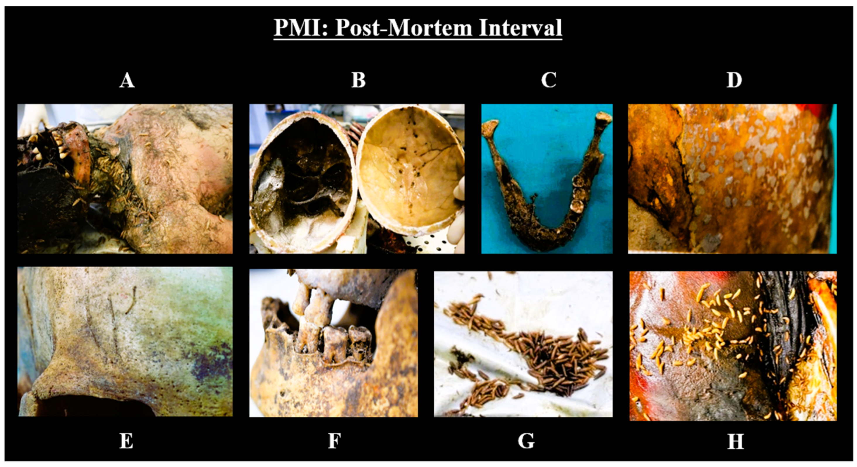 - Franceschetti, L.; Pelletti, G.; Fais, P.; Pelotti, S. Estimation of Late Postmortem Interval: Where Do We Stand? A Literature Review. Biology 2023, 12, 783. [Google Scholar] [CrossRef]