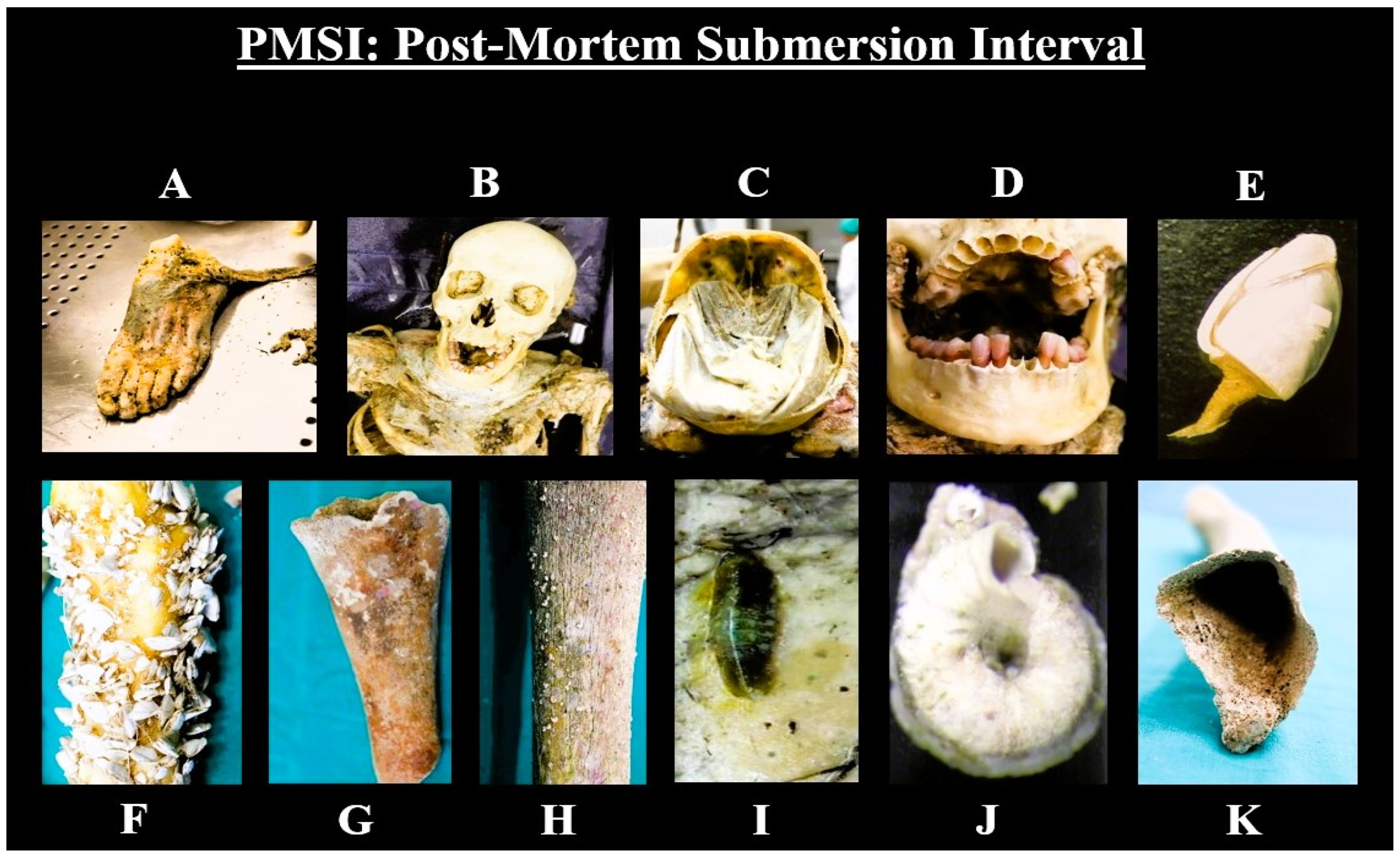 - Dalal, J.; Sharma, S.; Bhardwaj, T.; Dhattarwal, S.K. Assessment of Post-Mortem Submersion Interval Using Total Aquatic Decomposition Scores of Drowned Human Cadavers. J. Forensic Sci. 2023, 68, 549–557. [Google Scholar] [CrossRef] [PubMed]