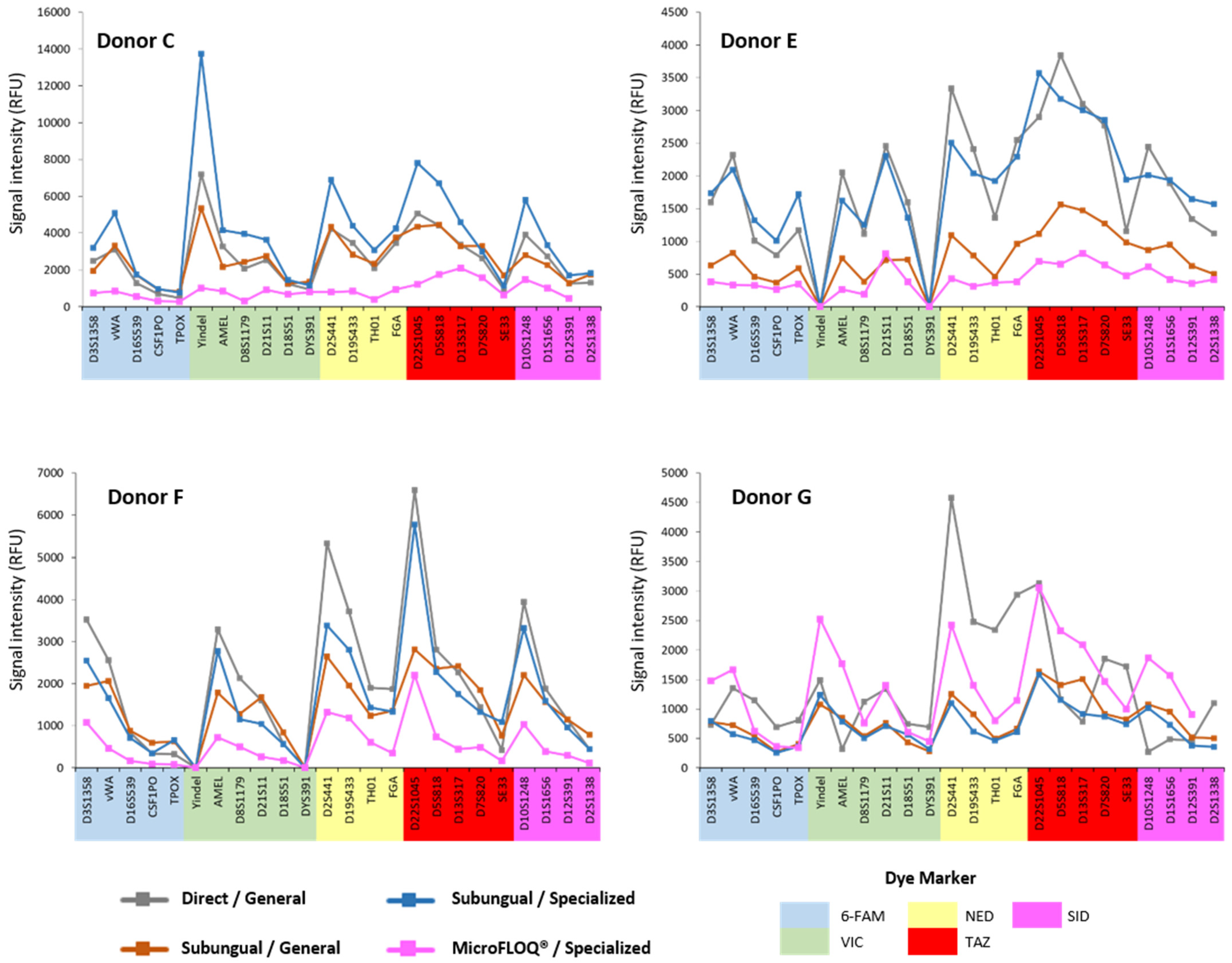 - Sherier, A.J.; Kieser, R.E.; Novroski, N.M.M.; Wendt, F.R.; King, J.L.; Woerner, A.E.; Ambers, A.; Garofano, P.; Budowle, B. Copan MicroFLOQ® Direct Swab Collection of Bloodstains, Saliva, and Semen on Cotton Cloth. Int. J. Leg. Med. 2020, 134, 45–54. [Google Scholar] [CrossRef] [PubMed]