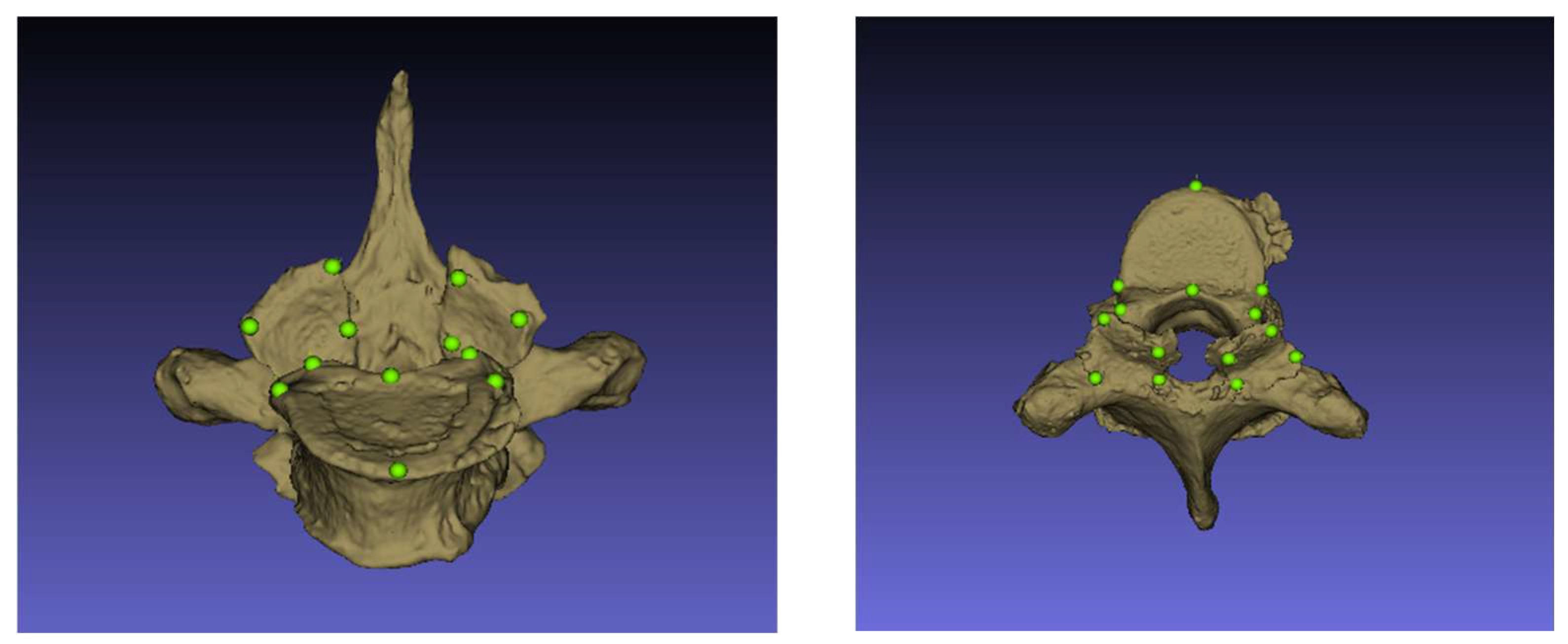 Figure 1). Each landmark placed on the 3D model of T4 was then mirrored at the corresponding anatomical point on T5. The same procedure was applied to the T5–T6 vertebral pair. The precise location and anatomical description of each landmark can be seen in