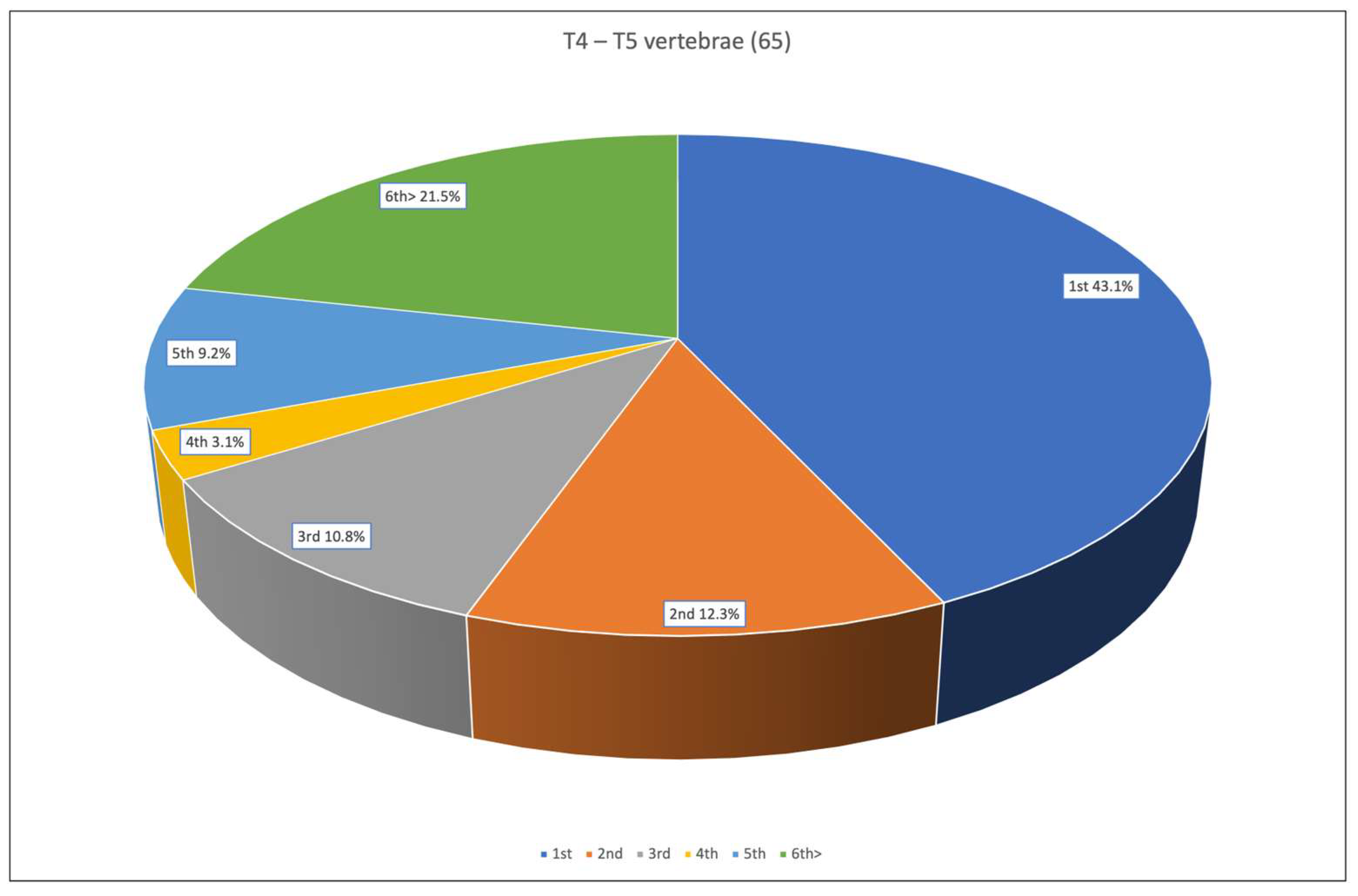 From the total of 65 analyzed T4–T5 pairs, 28 of the T5 vertebrae (43.1%) were correctly matched with the corresponding T4 from the same individual. An additional 5 T5 vertebrae (12.0%) were identified as the second closest match to their correct T4, while 7 T5 vertebrae (10.8%) were correctly matched as the third possible choice. 2 T5 vertebrae (3.1%) were correctly associated with their corresponding T4 at the fourth closest Euclidean distance, and 6 (9.2%) were matched at the fifth possible choice. Finally, 14 T5 vertebrae (21.5%) were correctly assigned only after the sixth possible choice. Overall, 43 out of 65 T5 vertebrae (66.2%) were correctly matched to their true corresponding T4 within the first three possible choices (