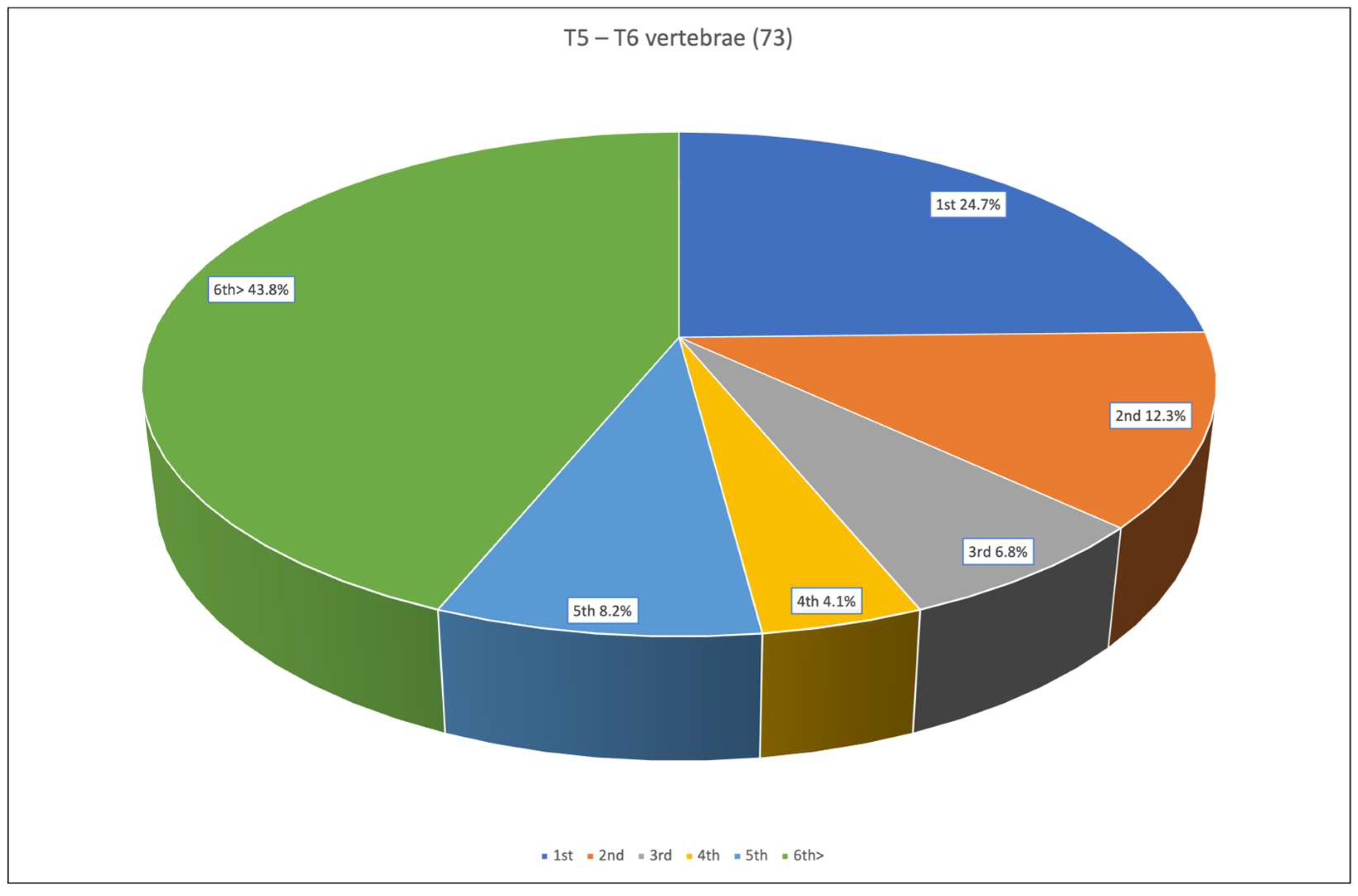 Of the 73 individuals in which the T5–T6 pairs were analyzed, 18 of the T6 vertebrae (24.7%) were correctly matched with the corresponding T5 from the same individual. An additional 9 T6 vertebrae (12.3%) were identified as the second closest match to their correct T5, while 5 T5 vertebrae (6.8%) were correctly matched as the third possible choice. 3 T6 vertebrae (4.1%) were correctly associated with their corresponding T5 at the fourth closest Euclidean distance, and 6 (8.2%) were matched at the fifth possible choice. Finally, 32 T6 vertebrae (43.8%) were correctly assigned only after the sixth possible choice. Overall, 32 out of 73 T6 vertebrae (43.8%) were correctly matched to their true corresponding T5 within the first three possible choices (