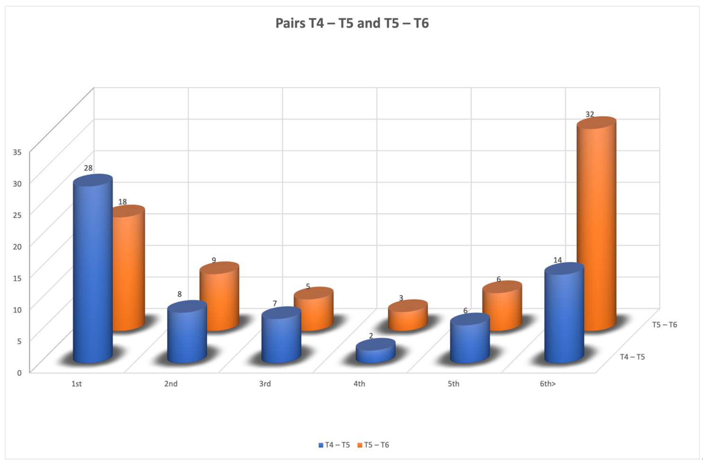 The results of both pairs were plotted on a single diagram, highlighting their similarities and differences. In the diagram, the T4–T5 pair is represented in blue color, while the T5–T6 pair is shown in orange color. The order of correct matches is displayed on the x-axis, with the numerical 1st, 2nd, 3rd, 4th, 5th, and 6th–12th, indicating at which ranking each vertebra was correctly reassociated. In both pairs, the number of correct matches decreases progressively from the first to the fifth choice, followed by an increase in the 6th–12th range. T5–T6 shows greater variability across categories, with both lower counts in early categories and a substantial spike in the final category, while T4–T5 shows a more balanced distribution, with its highest value at the first category but no extreme peaks thereafter (