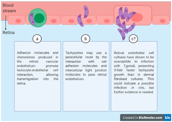 Three possible routes of T.gondii diffusion through the retinal endothelium. Created with BioRender.com (https://biorender.com/, accessed on 29 January 2021).