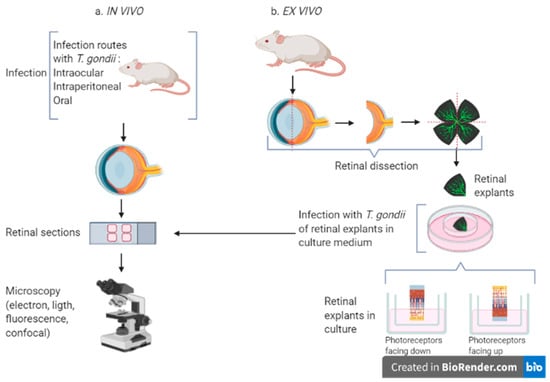 In vivo (a) and ex vivo (b) models to study Toxoplasma infection in the retina. For the in vivo infection, T. gondii is inoculated via intraocular, intraperitoneal or oral route. The ex vivo model uses retinal explants infected and maintained in culture. In both cases retinal sections are prepared from fixed tissue and observed with different types of microscopy. Created with BioRender.com (https://biorender.com/, accessed on 29 January 2021).