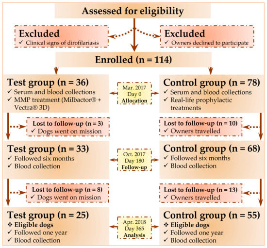 Dogs were recruited after obtaining owner consent. Inclusion criteria were qPCR-negative for at least one Dirofilaria spp., with the absence of clinical signs consistent with heartworm, which could be a threat to a dog’s life during the follow-up, an age of at least one year at the time of inclusion and the application of prophylactic treatment against dirofilariosis. Finally, dogs lost during follow-up were excluded from the study (Figure 1).