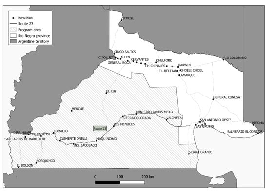 The control activities are centered in the south and west of the Province of Rio Negro, in the Patagonian region of Argentina, in the Departments of Bariloche, Ñorquinco, Pilcaniyeu, 25 de Mayo, 9 de Julio and Valcheta, ranging from the mountain towns of El Bolsón and San Carlos de Bariloche on the border with Chile in the east, to the rural zones of the Patagonian plateau areas of Cona Niyeu (Sierra Grande) and Aguada Cecilio (Valcheta) in the west (120,013 km2, with only 0.88 inhabitants per km2, Figure 1), across geographical coordinates ranging from −41.965530/−71.5341200 to −41.3308100/−69.5457600.
