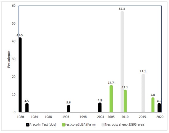 In 2003, the arecoline test was replaced by the copro Elisa/PCR test, which was used to confirm the identification of parasitic antigens by “in- house” tests on samples of canine fecal matter collected from the environment. The test was applied in randomized cross-sectional sampling in the periods 2003–2005, 2009–2010 and 2017–2018. According to the results, the surveillance system was based on the identification of both sheepfarms and/or the owners of dogs with current transmission; those with at least one positive result obtained from the animals’ fecal matter and confirmed by PCR, in were considered at risk [10,12,16].