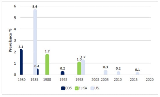 The initial prevalence rate in schoolchildren was 2.05% (CI 95%, 1.9–2.2), which then showed a descending curve, reaching 0.41% in 1984, and a rate of 0.20% (CI 0.1–0.3) positive DD5s was observed in 1993. With ELISA, the first study in 1988 showed a positive rate of 1.70% (95% CI 0.8–3.1), while the last screening showed a positive rate of 1.00% (0.7–2.2) [11,18].