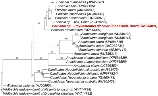 Phylogenetic tree based on an alignment of 522 bp of Ehrlichia gltA gene, using Maximum Likelihood method and TIM3 + F + I + G4 as evolutive model. Sequence from the present study is highlighted in red. Wolbachia spp. was used as outgroup.