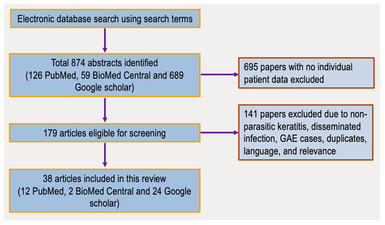 As shown in Figure 1, 874 abstracts were identified as potentially relevant for inclusion in the study from all databases searched (PubMed, 126; BioMed Central, 59; Google Scholar, 689). Screening through the title and abstracts while applying exclusion criteria (e.g., reports on veterinary cases, non-parasitic keratitis, other forms of infection [e.g., GAE or disseminated infection], lack of relevant information on individual patient history, clinical signs, diagnosis, treatment, or outcome) led to 24 papers being identified from Google Scholar. From PubMed, 32 papers were obtained, which were narrowed down to 12. Two case reports were gathered from BioMed Central. Duplicates were deleted using EndNote. We attempted to gather a representative sample of papers for each geographical region. This was made difficult by the lack of case reports with the desired inclusion criteria for Africa and South America, with only seven and three reports found, respectively. Initially, results were categorized into six groups, representing the relevant case reports through a strictly continental approach; however, six case reports were found from the Middle East, and this was added as an extra category as a subsection of Asia.