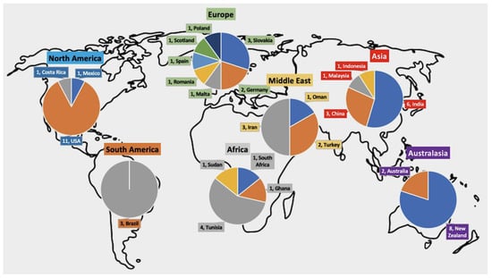 The review identified 38 eligible case reports that provided individual patient data for 60 patients (mean age [M] 34.1 years, standard deviation [S.D.] = 15.1, the gender ratio was 11:19 male to female, 22 males (36.6%), 38 females (63.3%) (Figure A1). The global geographical distribution of all reported AK cases is shown in Figure 2. The largest number of cases was reported from North America (n = 13), followed by Asia (n = 11), Europe (n = 10), Australasia (n = 10), Africa (n = 7), and Middle East (n = 6), and the lowest number of cases was reported from South America (n = 3).