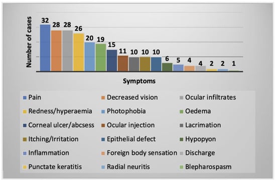 The frequency of clinical symptoms reported from all AK cases. Decreased vision included blurry vision, decreased visual acuity, and loss of vision. Ocular infiltrates included corneal, stromal, and other precipitates.