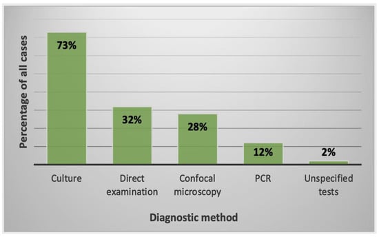 From a global perspective, culture was the most utilized diagnostic method. Figure 4 identifies all the diagnostic methods reported to have been utilized from individual patient data. Combined diagnostic testing occurred in 42% (25/60) of identified cases.