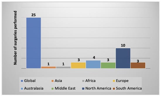 Global and regional proportions of surgeries performed in cases of AK, including Asia (9%; 1/11), Africa (14%; 1/7), Europe (30%; 3/10), Australasia (40%; 4/10), Middle East (50%; 3/6), North America (77%; 10/13), and South America (100%; 3/3).