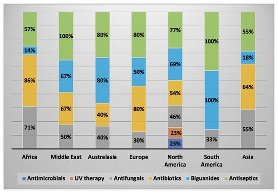 A total of seven cases were reported from Africa. The age range of AK patients was 17–55 years old (M = 29.14, S.D. = 12.41). Contact lenses were utilized in five cases (71%). The most common diagnostic method used was culture, utilized in five cases (71%). Combined diagnostic efforts were used in three cases (43%). There was one case series with three cases reported. Combined drug therapy was used in six cases (86%). The percentages of drugs used in the treatment of AK are shown in Figure 7. Additional information about the management of AK in Africa is presented in Table A1. The outcome of all cases showed general improvement of clinical signs with no recurrence of the infection. Remaining corneal opacities or decreased visual acuity were present in five cases (71%).