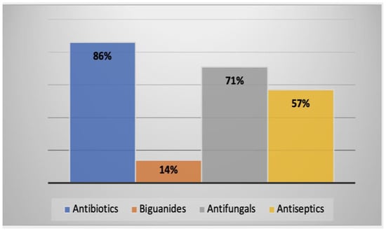The percentages of drug classes used for treatment of AK patients in Africa. Antibiotics were used in 86% of identified cases (neomycin (4), gentamicin (2), vancomycin (2), cefotaxime-fosfomycin (1), chloramphenicol (1)). Biguanides were used in 14% of identified cases (PHMB (1)). Antifungals were used in 71% of identified cases (econazole (1), amphotericin B (1), ketoconazole (2), fluconazole (1)). Antiseptics were used in 57% of identified cases (hexamidine (4), chlorhexidine (1)).