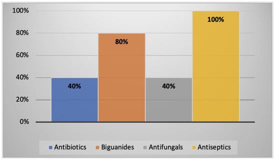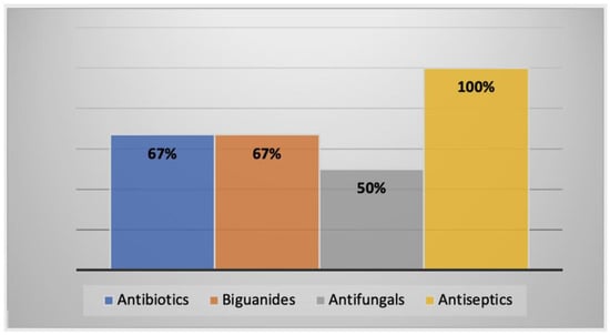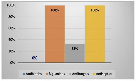 The percentages of drug classes used for the treatment of AK patients in the Middle East. Antibiotics were used in 67% of identified cases (neomycin (1), vancomycin (1), moxifloxacin (2), polymyxin B (1), ceftazidime (1)). Biguanides were used in 67% of identified cases (PHMB (4)). Antifungals were used in 50% of identified cases (ketoconazole (1), fluconazole (1), itraconazole (1)). Antiseptics were used in 100% of identified cases (chlorhexidine (3), propamidine isethionate (4)).