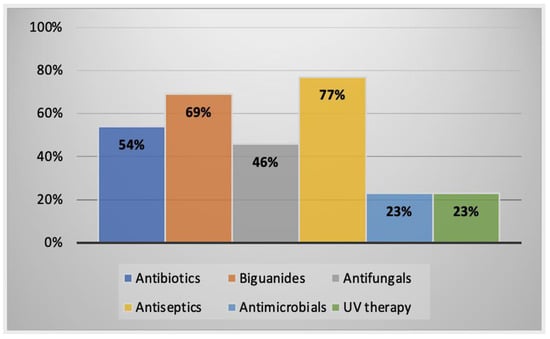 The percentages of drug classes used for the treatment of AK in North America. Antibiotics were used in 54% of identified cases (netilmicin (1), polymyxin B (1), besifloxacin (1), moxifloxacin (3), sulfamethoxazole (2), trimethoprim (2), ofloxacin (1), tobramycin (1)). Antifungals were used in 46% of identified cases (itraconazole (1), fluconazole (1), voriconazole (5)). Biguanides were used in 69% of identified cases (PHMB (9)). Antiseptics were used in 77% of identified cases (propamidine isethionate (3), hexamidine (1), chlorhexidine (9), pentamidine (1)). Antimicrobials were used in 23% of identified cases (miltefosine (3)). UV therapy was used in 23% of identified cases (UVA and B2 (3)).