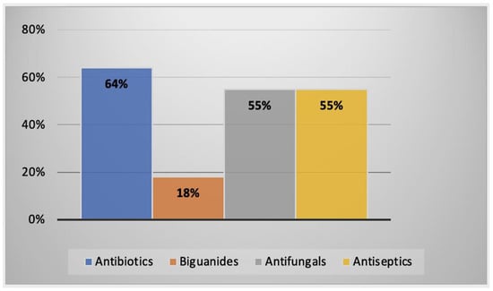The percentages of drug classes used for the treatment of AK in Asia. Antibiotics were used in 64% of identified cases (neomycin (7), polymyxin B (7), bacitracin (6), gramicidin (1), gentamicin (1)). Antifungals were used in 55% of identified cases (miconazole (3), metronidazole (3), ketoconazole (3)). Biguanides were used in 18% of identified cases (PHMB (2)). Antiseptics were used in 55% of identified cases (propamidine isethionate (3), chlorhexidine (3)).