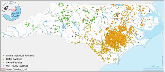 50. North Carolina Division of Environmental Quality. Animal Facility Map. Available online: https://deq.nc.gov/cafo-map (accessed on 2 May 2022).