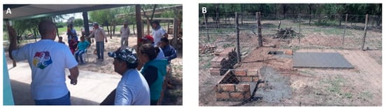 Images of fieldwork in the Department of General Taboada, Santiago del Estero, Argentina. (A) Community meeting to explain the cycle of the parasite. (B) Sanitary well, built in the Miel de Palo settlement.