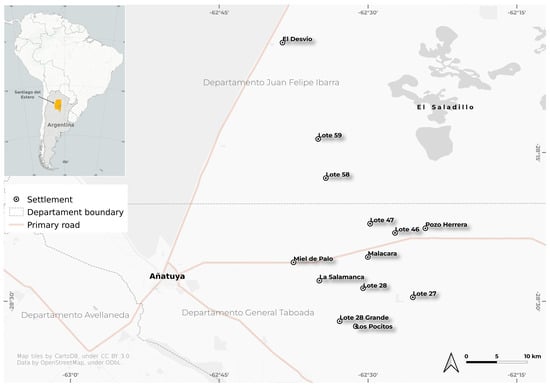 Añatuya is located 184 km from the Capital of Santiago del Estero, Northeast Region of Argentina. This city has an extensive rural area with different rural settlements, and they are all located within the Department of General Taboada. This area is part of the semi-arid sub-region of the Great Chaco [33], and the climate is usually divided into two main seasons; dry and mild from April to September and hot and rainy from October to March [33]. The study described here was carried out in 10 rural settlements close to Añatuya: El Malacara, El Desvío, Lote 27, Lote 28, Lote 28 Grande, Lote 46, Lote 47, Lote 59, Miel de Palo, and Pozo Herrera (Figure 2). There is a low population density in the province, and the Department of General Taboada has approximately 38,000 inhabitants living in 9073 households, with most of the inhabitants, 23,286, living in the city of Añatuya [34]. In the rural settlements included in this study, there are approximately 398 households. The most common livelihood in this area is animal farming (sheep and goat) and day laborers, although most inhabitants do not have formal jobs and many adults receive government pensions, retirement allowances or child subsidies [35].
