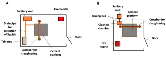 Sanitary well models constructed by the community with supervision from the project´s foreman in the rural settlement of Miel de Palo, General Taboada, Santiago del Estero (Argentina). (A) Model with the sanitary well located withing the closed structure and with a tabletop for processing of the slaughtered animal. (B) Model with the sanitary well located outside the closed structure and with a simple cleaning chamber.