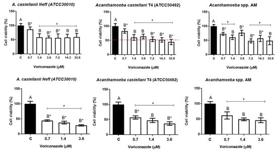 To evaluate the biological activity of voriconazole against Acanthamoeba spp., 8 × 104 trophozoites/mL in PYG medium of A. castellanii Neff (ATCC 30010), A. castellanii T4 (ATCC 50492), and the clinical isolate AM were aliquot in 96-well plates. Voriconazole were tested at concentrations of 0.7 µM, 1.4 µM, 3.6 µM, 7.2 µM, 14.3 µM, and 35.8 µM. The plates were incubated at 30 °C for 24 and 48 h, with an observation of the growth kinetics at 6, 12, 24, and 48 h of incubation. As a negative control, 0.125% DMSO solution in PYG was used. Viable cells were quantified using the Fuchs–Rosenthal counting chamber, and the cell viability was analyzed using 0.4% trypan blue. The experiments were performed in independent triplicates. The results obtained were expressed as a percentage of viable trophozoites.