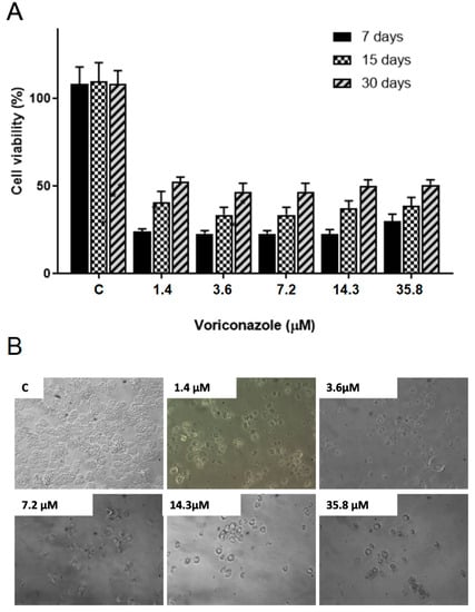 Evaluation of the stability of the biological activity of voriconazole against Acanthamoeba castellanii T4 trophozoites. (A) Viability for the A. castellanii T4 trophozoite strain (ATCC 50492) after incubation for 72 h with free voriconazole stored for 7, 15, and 30 days. * p-value < 0.05 compared to the negative control (Kruskall-Wallis post-test). The results correspond to the mean ± SEM of the mean of three independent experiments. (B) Micrographs demonstrate the decrease in viability at different voriconazole concentrations. Images at 200× magnification.