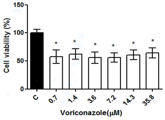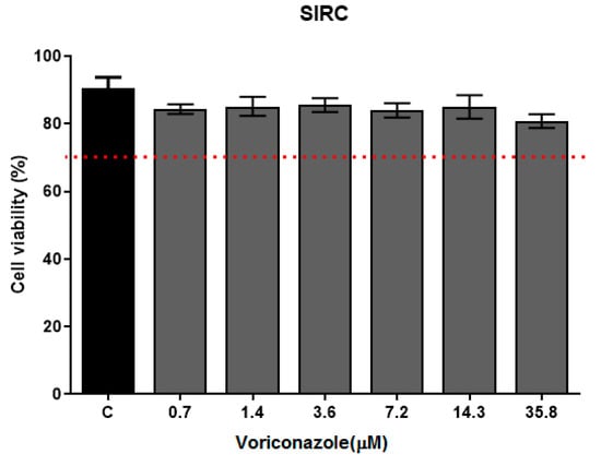 Cell viability of SIRC after voriconazole treatment. Cytotoxicity assay with SIRC cells (Statens Seruminstitut Rabbit Cornea) (ATCC®–CCL 60) in exposure to voriconazole for 24 h followed by the addition of MTT (3-(4,5-Dimethylthiazol-2-yl)-2,5 diphenyltetrazolium bromide) 0.5 mg/mL. The results correspond to the mean ± standard error of the mean of three independent experiments in triplicate. * p-value < 0.05, compared to the negative control—DMSO 0.125% (Kruskall-Wallis post-test). The dashed line indicates 70% viability.