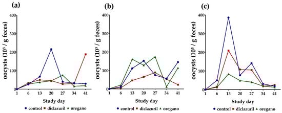 The oocysts per gram of feces for the three individual trials: (a) trial 1, (b) trial 2 and (c) trial 3.