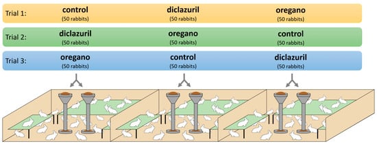 This study was carried out with three trials, including a total of 450 rabbits. In each trial 150 rabbits were included, and were divided into three subgroups of 50 animals per feed variant (CG, DG and OG), resulting in a total of nine subgroups in this study. Between the trials, the feed variant administered changed in the respective pen, so that each feed variant was administered in each pen (Figure 2). Each trial lasted for a fattening period of 41 days and ended at slaughter. Three days before the end of each trial (SD 38), the animals received a conventional fattening rabbit diet without coccidiostats to meet the legal withdrawal period for diclazuril. To ensure equal conditions between the subgroups, all the animals were subjected to this change in diet.