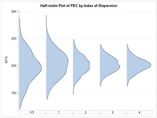 The mean egg counts and the estimated values of k in the simulated flocks varied from the values specified in the RAND function, especially when the number of individuals in the simulated flock was small. To minimise the complications caused by these deviations, each flock was created at least 20 times, and the flocks with parameter values closest to the RAND function were used. Table 2 lists the values in the simulated flocks; these flocks provided the samples that were used to create the half-violin plots. All flocks used in the modelling had mean egg counts within five eggs of the values specified in the RAND function. All values of k fell within the 95% WALD confidence limits of the specified value.