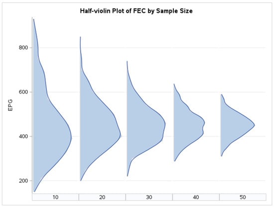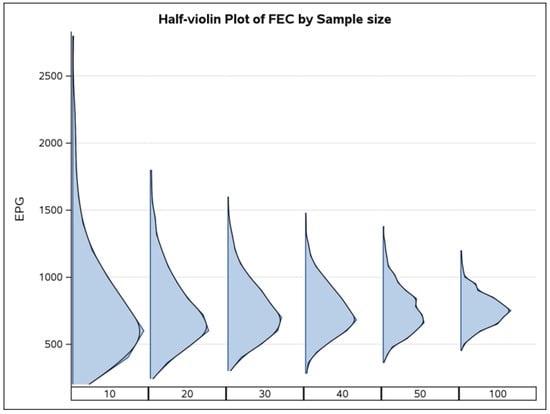 Figure 5 presents a half-violin plot of sampling in a plausible scenario using options that produce low precision in the estimated mean. The options were k = 0.5, a sample size of 10, 20, 30, 40, 50 or 100 individuals from a simulated flock of 1000 individuals and a mean egg count of 750 eggs per gram. The means and standard deviations for the distribution of mean egg counts from samples of 10, 20, 30, 40, 50 or 100 individuals were 736.1 ± 388.2, 756.0 ± 276.5, 742.8 ± 212.2, 745.8 ± 188.4, 749.2 ± 163.5 and 749.2 ± 114.4. The sample means were clustered around 750, indicating that the means were not systematically biased. The standard deviations were quite large but fell from 388 to 114 as the sample size increased from 10 to 100 individuals per sample. The Shapiro–Wilk test showed that the observed distribution of means was significantly different from a normal distribution for all sample sizes from 10 to 100 (p< 0.01). The distribution was markedly right skewed mean for a sample size of 10, but the skewness decreased as the sample size increased. One consequence of the pronounced right skew with sample sizes of 10 individuals is that most estimates of the mean will fall below the flock mean. The mode of the distribution was only 525 eggs per gram, while a small number of means overestimated the flock mean. The estimated flock mean egg counts ranged from 80 to 3010 eggs per gram.