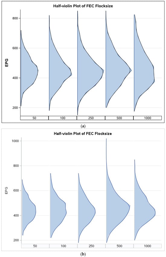 All modelling was done in SAS on demand for Academics from November 2022 to November 2023; SAS release: 9.04.01M7P08062020. Modelling proceeded in two stages. Firstly, flocks of various sizes were created. Then, these flocks were sampled under different scenarios. Half-violin plots were used to plot the range of mean egg counts in 1000 replicate samples for each scenario. Half-violin plots were chosen to facilitate the comparison of distributions obtained from different scenarios.