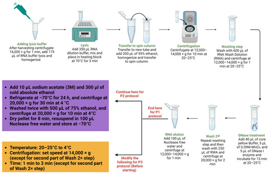 We performed three different protocols based on this commercial kit: the first followed the manufacturer’s instructions (P1) (Figure 2), and the second protocol (P2) followed the same methodology (Figure 2) but added a precipitation stage once the RNA was eluted, using 10% sodium acetate (3M) of the total volume of eluted RNA, and 3 volumes (total eluted RNA) of cold molecular biology-grade absolute ethanol. Samples were refrigerated at −70 °C for 24 h, and then centrifuged at 20,000× g and 4 °C for 30 min. The pellet was washed twice, with 500 μL of 75% ethanol, and centrifuged at 20,000× g for 10 min. The supernatant was removed, and the pellet was allowed to dry for 8 min. Finally, the pellet was resuspended in nuclease-free water according to the final volume required and stored at −70 °C [15]. In the last protocol (P3) (Figure 2), changes were made to the centrifugation temperature, being altered from 20–25 °C to 4 °C, and the speed was set to 14,000× g and the time set from 1 min to 3 min.
