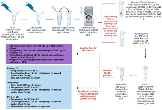 Workflow of the QIAGEN RNeasy Mini Kit extraction protocols (created with BioRender.com).