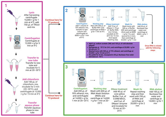 Three different methodologies were implemented for the RNA extractions based on the Invitrogen TRIzol Reagent kit: the first followed the manufacturer’s instructions (T1) (Figure 4); the second combined the Invitrogen TRIzol Reagent lysis procedure and the QIAGEN RNeasy Mini kit, with centrifugation and temperature modifications (T2) (Figure 5); and the third combined the Invitrogen TRIzol Reagent lysis procedure and the PROMEGA SV Total RNA Isolation System (T3) (Figure 5).